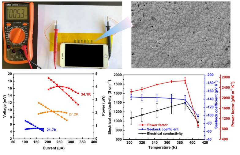 将复合膜组装成6个热电单臂柔性热电器件,在温差34.1 K时的最大功率密度高达37.6 W m-2。归一化的最大功率密度PDmax·l/ΔT2也高于已报道的柔性热电器件的值。将该6单臂器件放置于刚运行过游戏软件的手机下,手机温度与室温间9.4 K的温差下,该柔性热电器件产生了5.3 mV的电压。表明这种超高性能柔性热电薄膜在可穿戴设备中有潜在的应用。上述工作以 “Exceptionally high power factor Ag2Se/Se/polypyrrole composite films for flexible thermoelectric generators”为题发表于Advanced Functional Materials上。论文第一作者为歪歪漫画