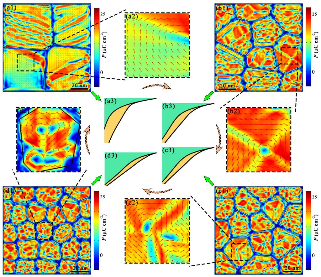 储能材料与器件是近年来功能材料领域的研究热点。其中,电介质储能材料具有高功率密度、快速的充放电速度以及长循环寿命等优点,有望在混合动力汽车、大功率换能器以及大功率脉冲设备中得到广泛应用。然而,当前大部分电介质电容器的储能密度和效率都较低,限制了其在先进电子器件的进一步发展。为了提高电介质的储能性能,畴工程是常用的策略之一。其中,很多独特的电畴结构,包括极性纳米微区、泥状极性区、拓扑漩涡畴等都深刻影响着电介质材料的储能特性。