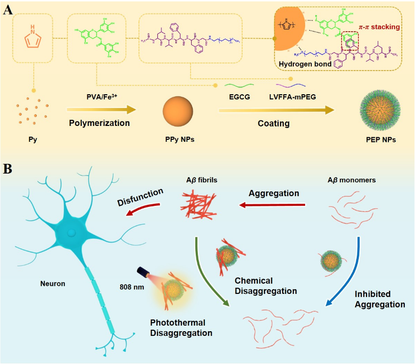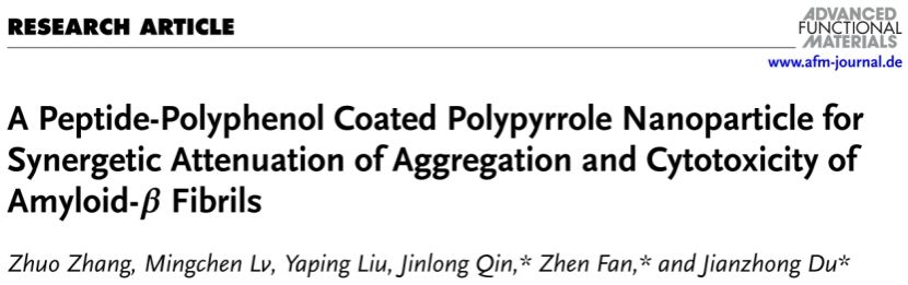 研究成果近期以“A Peptide-Polyphenol Coated Polypyrrole Nanoparticle for Synergetic Attenuation of Aggregation and Cytotoxicity of Amyloid-β Fibrils” 为题发表在《先进功能材料》(Adv. Funct. Mater. 2024, 2401208)。歪歪漫画