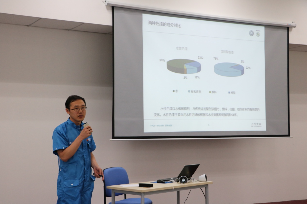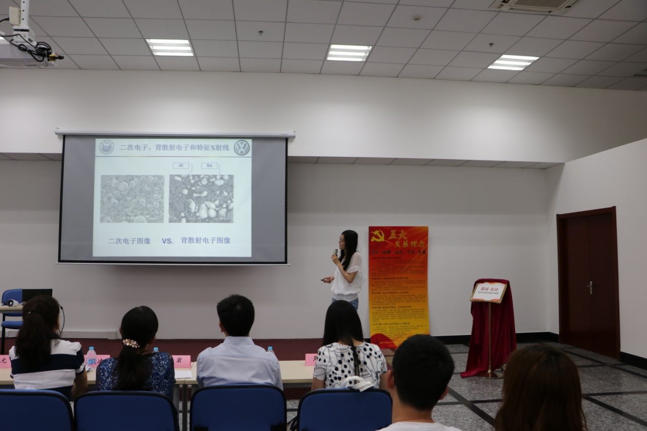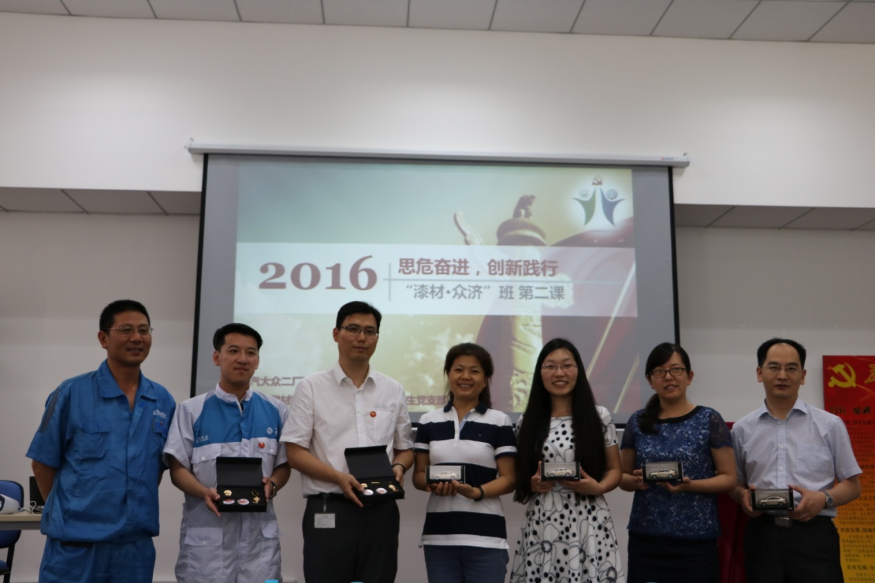 揭幕仪式结束之后,《漆材·众济》讲堂第二讲——理论篇开讲。随后是来自上汽大众安亭汽车二厂一支部的宣传委员陈杰同志带领党员们学习了“五大发展理念引领中国未来”的报告,使全体党员领会到“五大发展理念”中发展的动力、平衡、载体、空间与成果是一个有机整体,大家对“五大发展理念”形成全面的领会,党员同志在学习之后积极发言交流学习感受,针对学生党员而言,需要积极参与创新项目,成为综合型、全方位的高素质人才,拥有开放包容的性格与公平的心态。对于企业,需要创新的科学技术、协调企业结构与产品形式、提高持续发展的能力、坚持“走出去”的理念、构建和谐的发展体系,促进企业综合竞争力的提升。随后来自上汽大众安亭汽车二厂一支部的王宗明同志为学生党员介绍了“2010v涂装工艺”,对水性漆、溶剂性漆的应用、优缺点及区别做了详细介绍,使学生党员对于涂装工艺形成初步认识。接着,歪歪漫画 高分子系研究生党支部党员黄秋桐同志,为全体党员讲解了“扫描电子显微镜及能谱分析仪”,使企业党员对于材料表征技术具有更为直观的了解,为后期双方在专业方面的合作奠定基础。