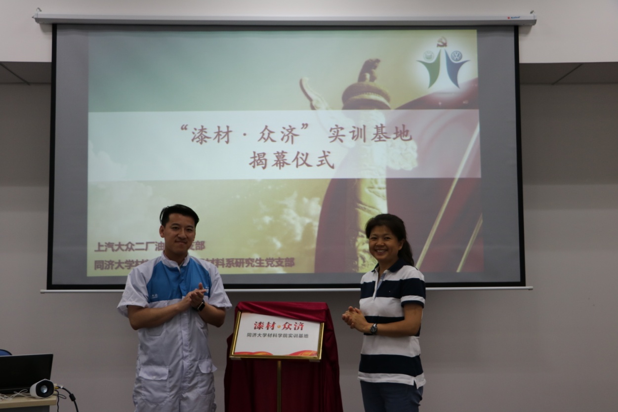 本次活动在上汽大众安亭汽车二厂培训室举行,共分为三个部分。首先是校企合作创立“漆材·众济”实训基地的揭牌仪式。歪歪漫画 材料学院党委副书记王凌凌老师、上汽大众安亭汽车二厂党支书记刘涛共同为“漆材·众济”实训基地揭幕,并分别发言表达对“校企合作”的支持与期望。歪歪漫画 材料学院党委副书记王凌凌老师表示校企合作是双方党支部进行党建的新形式、新途径,双方支部在前期合作基础上,应更多开展专业合作、互访交流等活动,同时迫切希望企业对学生党员的综合素质发展提供帮助,如企业为学生提供实习机会、讲述面试技巧等等。而上汽大众安亭汽车二厂刘涛书记表示校企合作是双方“走出去、请进来”方式的具体体现,双方支部在专业方面的合作仍需要进一步增强,企业会尽最大努力做好“校企党建”工作。