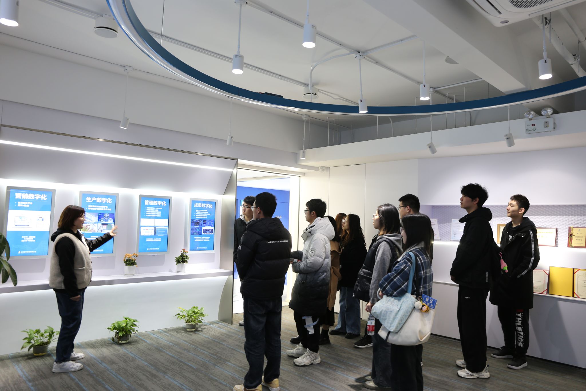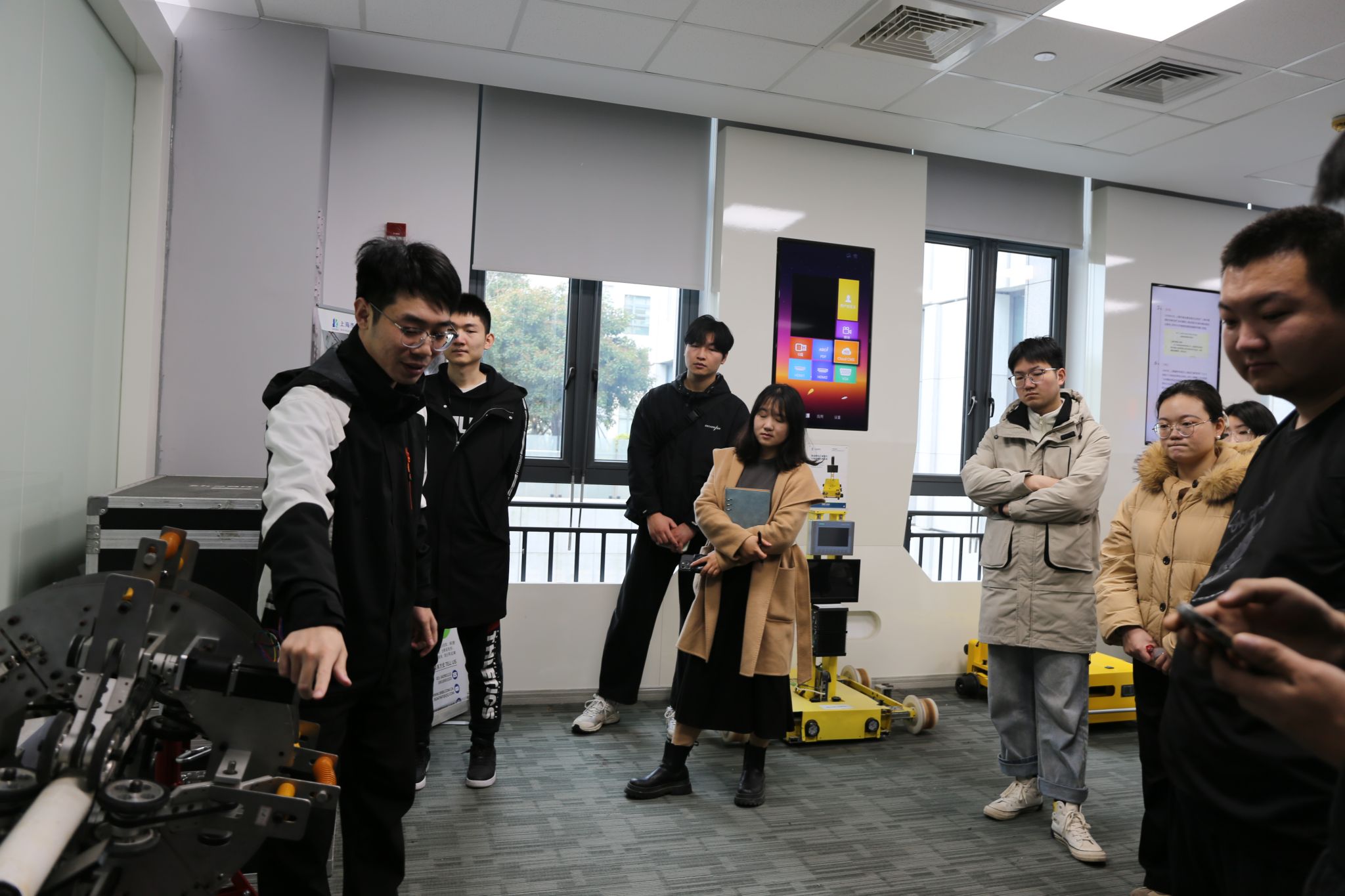 活动伊始,师生参观了检验公司材料检测展厅与数字化展厅。工作人员详细阐释了上海建科在大型工程检测(如世博会项目等)、家具环境模拟检测、汽车零部件自然环境测试等领域的核心技术及认证服务,生动展示了公司自主研发的“安全管家大数据云平台”“混凝土检测机器人模型”等数字化成果。在建科院科研成果展厅,师生一行深入了解传统检测技术与人工智能的深度融合,清晰地认识到当前检测行业的最新发展态势。盾构隧道激光扫描设备、爬索机器人等创新装备,不仅令大家直观感受到检测行业智能化转型的趋势,更使我们得以探寻这些创新成果背后的研发故事。