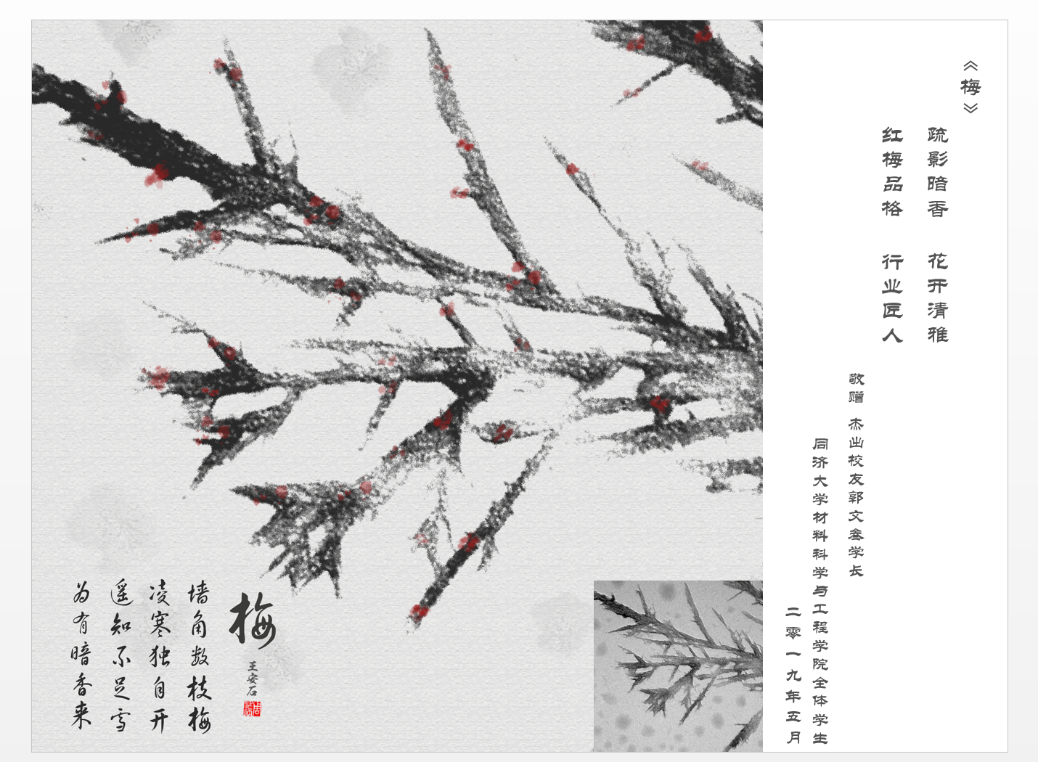 微结构大赛特等奖作品:《梅》,并赋诗一首:“疏影暗香,花开清雅,红梅品格,行业匠人”,以表达对学长的敬仰之情。学院党委书记王中平和学科委员会主任黄云辉向郭文叁校友和胡金华校友赠送纪念证书,感谢两位校友对歪歪漫画