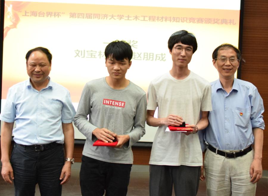 获得低年级组三等奖的同学有娄域杰、杨永泽、陈梓润、孔维依、周袁宇和陈沈旖。获得高年级组三等奖的同学有陈佩瑶、汪琪、邓惠君、孙宇星、张晓凡和徐英楠。获得低年级组二等奖的同学为严德裕、杨肯和刘鑫,获得高年级组二等奖的同学为李磊、汪江福和黄舒婷。本次竞赛低年级组和高年级组桂冠则分别被刘宝林和赵朋成两位同学摘得。上海台界化工有限公司邵田云董事长和材料学院王中平书记为获得一等奖的同学颁奖。