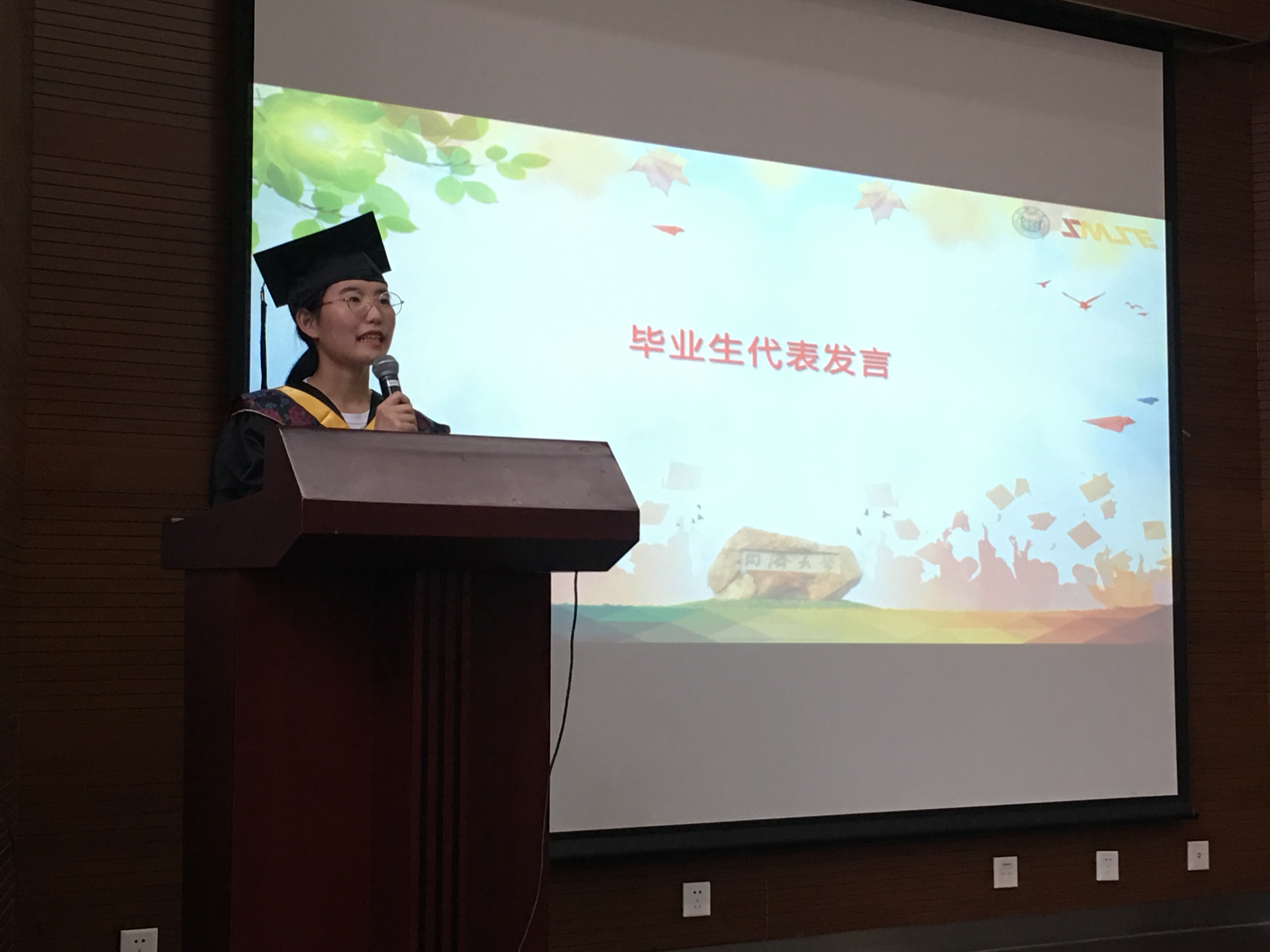 然后,毕业生代表陈钰婷代表全体毕业生发言。她感慨大学四年白驹过隙,同学们入学的各种经历仿佛发生在昨天。她还与全体毕业生一起回忆了在四平路校区和嘉定校区学习、生活、工作的点点滴滴,引起了大家的共鸣。她感谢同济教会了大家 “同舟共济、自强不息”的拼搏精神、 “严谨、求实、团结、创新”的治学态度、 “同心同德同舟楫,济人济事济天下”的博大胸襟,还感谢了各位老师的呵护和教导,最后号召同学们负担起时代的重任,将论文写在祖国的大地上。