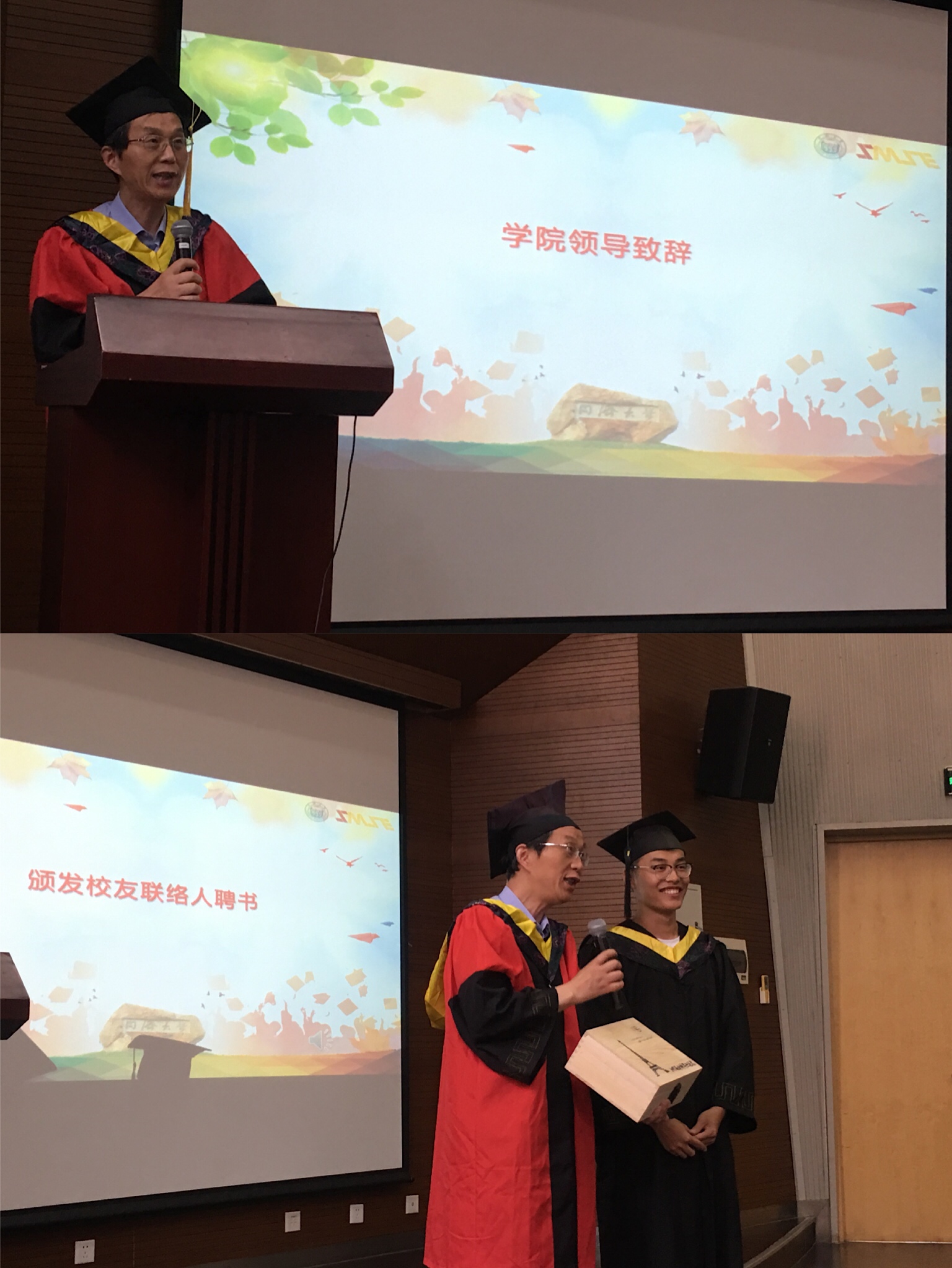接着,材料学院93级校友徐凯与各位毕业生分享了自己多年来的学习和成长经历。他建议同学们要勇敢、要自信、要有理想和主动的人生规划、要有格局和胸怀、要有爱心和感恩的心、要养成终身学习的习惯、要不断地完善自我。他还分享了当初他毕业时老师提到的底线要求:不求为母校争光,但求不给母校抹黑。他勉励各位毕业生要立足自我、多干实事、少出笑话、努力拼搏,既要仰望星空,又要脚踏实地,拼搏出一个不一样的自我,为母校增彩,为社会发展做出自己的贡献。