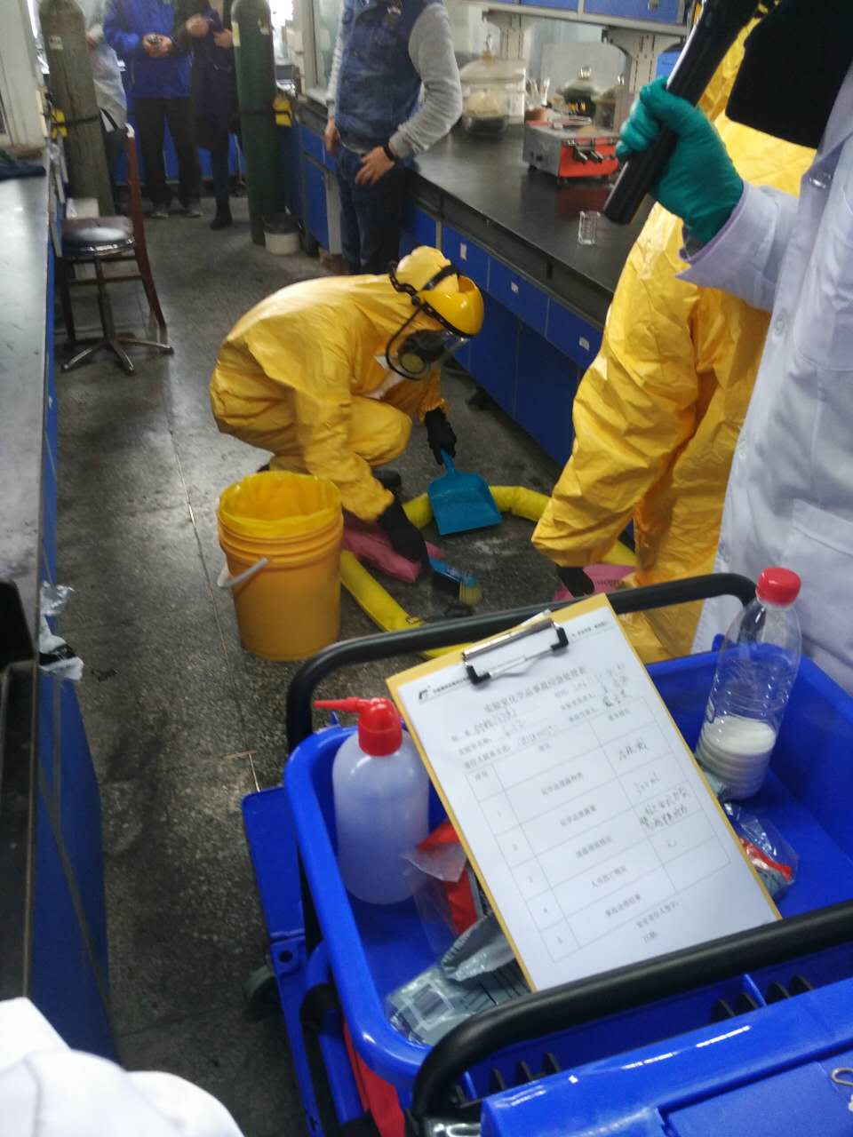 学院安全员立即安排了专业救护队员赶赴现场紧急处置了这一突发事件。依次对“浓硫酸”进行围堵、吸收、中和及处理完毕后处置人员的清洗工作。