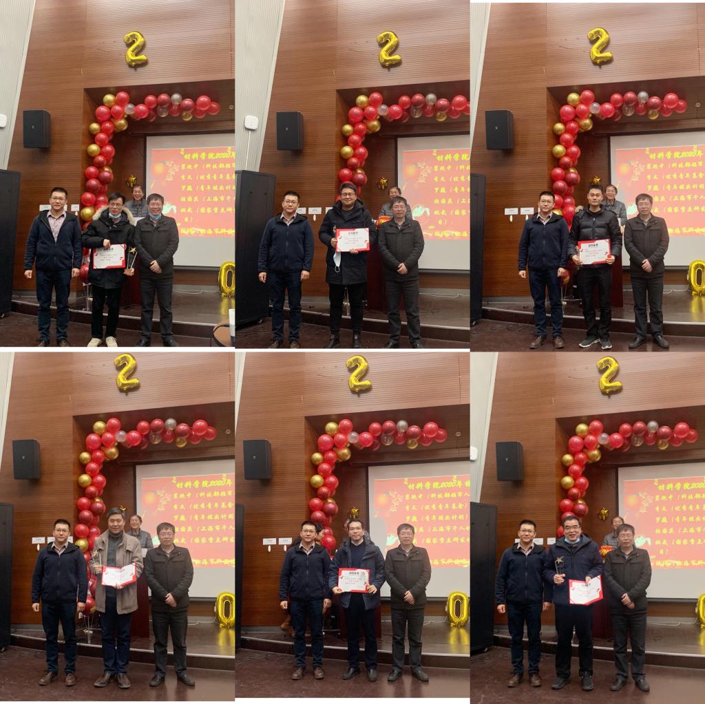 随后的表彰环节格外热闹,学院对获得2020年度上海市级奖励、校级奖励、年度考核优秀的人进行表彰,同时许维院长和黄佳副院长对获得材料学院2020年特别贡献奖的老师颁发了荣誉证书和奖杯。