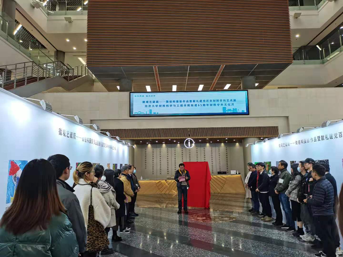 与图书馆联合主办的“微观艺葳蕤——微结构摄影作品展暨献礼建党百年材料学科学科文化月”系列活动在嘉定校区图书馆一楼大厅正式开幕。开幕式由材料学院党委书记王中平主持。校党委副书记吴广明,嘉定校区党工委副书记覃文忠、学研工部副部长谭武、艺术与传媒学院教授于澎一同出席了开幕式。图书馆党委副书记何青芳、材料学院党委副书记袁华、王凌凌等图书馆、材料学院教师、学生代表近50人参加开幕活动。