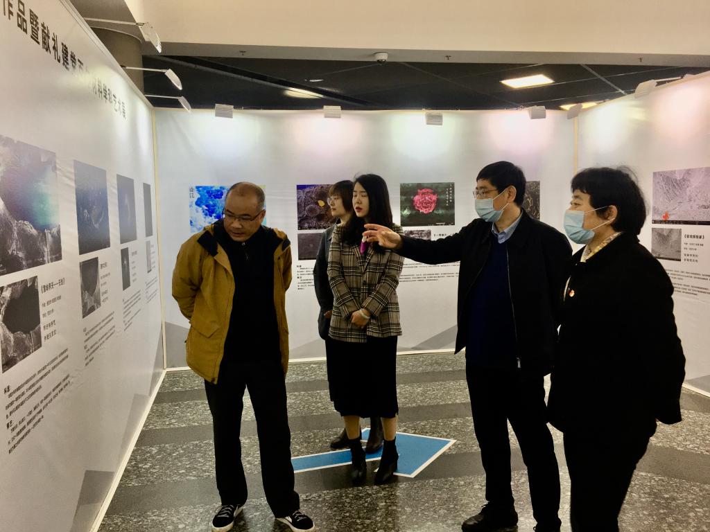 在长期的办学历程中,形成了独具特色的大学文化,集中体现在以“同舟共济,自强不息”为核心的同济精神,体现在以“同心同德同舟楫,济人济事济天下”为特色的人文情怀,体现在以“矢志不渝的爱国传统,严谨求实的科学态度,自强不息的奋斗精神,同舟共济的和谐理想”为内涵的精神价值。同时,高度肯定了材料在人类发展史上的重要作用,材料发展史就是一部人类发展文明史、文化史,材料学科对于解决卡脖子问题关键作用。这次联合举办的“微观艺葳蕤——微结构摄影作品展“通过材料微结构的艺术展示,实现了科学与艺术的交融,展示了独特材料文化的魅力。最后,吴广明及莅临嘉宾们共同为“微结构摄影作品展”揭幕。
