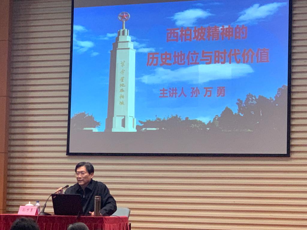 孙万勇教授从历史选择了西柏坡、西柏坡精神是我党伟大斗争实践的结晶、西柏坡精神的特殊品质和西柏坡精神的时代价值四个方面进行阐述,孙教授表示,历史上的今天(1949年3月23日),碰巧是中共中央从西柏坡出发,踏上进京“赶考路”的日子,在这个特殊的日子,孙教授带领我们一起“走进”西柏坡,他指出,党中央之所以选择西柏坡,主要是因为西柏坡安全便利、物产丰富、群众基础好。中共中央在西柏坡期间开创了四大伟业:指挥战略决战。取得了辽沈、淮海、平津三大战役的完胜,消灭国民党赖以发动内战的主要力量;掀起土改风暴,让亿万农民翻身解放;推动工作重心转移,召开七届二中全会;筹划建设新中国,新中国从这里走来。诞生了包括敢于斗争、敢于胜利;强化纪律、民主集中;实事求是、从实际出发;善于学习、与时俱进;两个务必和赶考精神;民主建政;以人民为中心等一系列伟大的精神。孙教授表示西柏坡精神具有特殊性、丰富性、继承性与创新性,两个务必和赶考精神,是新时代立于不败之地的政治基因。敢于斗争、敢于胜利的精神,是新时代应当具备的思想品质。善于学习、与时俱进的精神,是新时代克敌制胜的看家本领。在新时代,更要坚持不懈弘扬西柏坡精神,干实事,开新局。