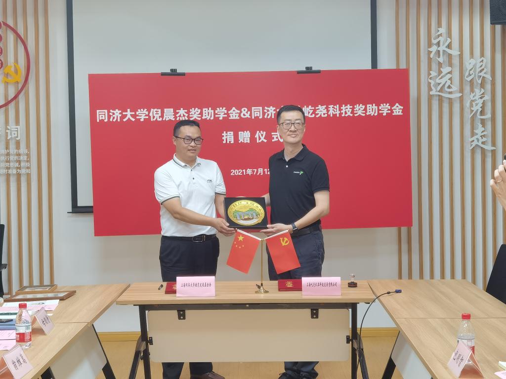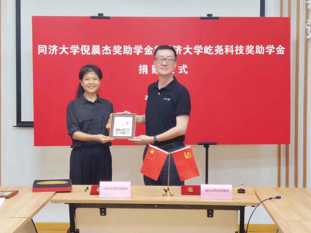 屹尧科技奖助学金”,奖励和资助两学院学生,激励学生努力学习,培养更多优秀基础学科学子,胸怀家国、建功立业。仪式上,倪晨杰校友与教育发展基金会副秘书长梁春江签署捐赠协议。倪晨杰向梁春江赠与捐赠支票,梁春江向倪晨杰颁发捐赠证书,王凌凌向倪晨杰赠送学籍卡,母朝静向倪晨杰赠送同济纪念品。