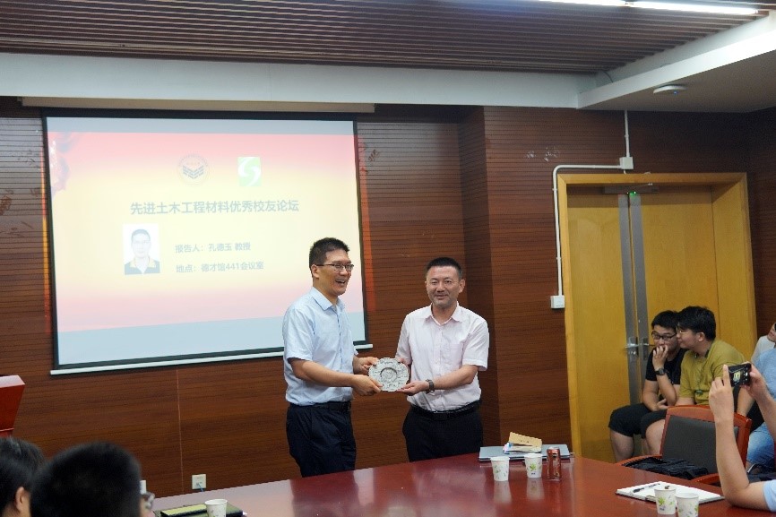 优秀校友---浙江工业大学的孔德玉教授,并邀请孔教授作名为“基于固相水化理论的水泥基材料缓凝机理——以蔗糖与氢氧化锌为例”的学术讲座(图1)。孔教授在系统分析水泥水化机制的基础上,深入浅出地阐释蔗糖与氢氧化锌等化合物对水化进程的影响,获得了在场师生的高度关注和积极点评。为答谢孔教授多年来对材料学院的持续关注和支持,报告结束后,孙振平老师代表学院及系赠上纪念品(图2)。随后,在激情澎湃的颁奖音乐声中,颁奖仪式拉开序幕,孙振平老师、孔德玉教授、张国防老师、吴凯老师、徐玲琳老师和卢子臣老师等嘉宾为获奖同学颁奖并合影留念。