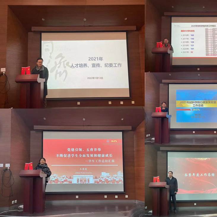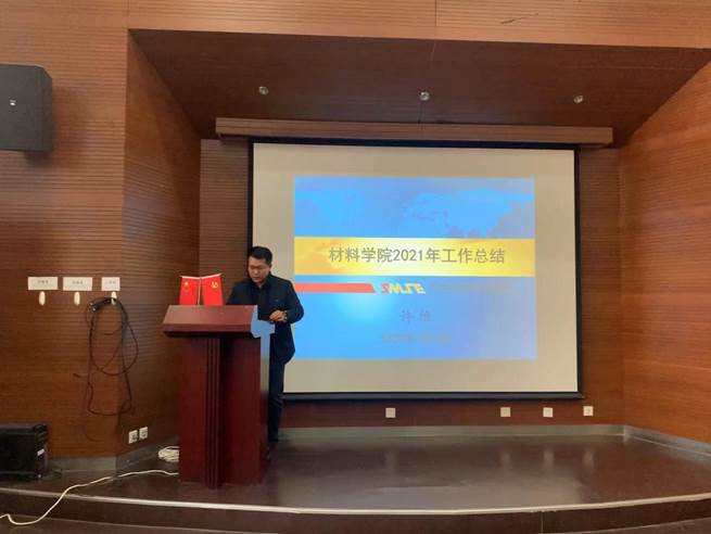 院长许维作了材料学院2021年学院总结报告,总结了2021年学院的工作亮点、指出存在的差距和不足、制定了2022年工作目标以及主要任务举措。报告指出:这一年,立德树人成效进一步提升,国家级高层次人才计划(项目)继续取得突破性进展,基础研究成果持续取得进展,国家级平台申报取得了突破,本科专业建设取得显著成效。材料学科国际影响力稳步提升,2021年成功跻身ESI全球排名前千分之一。学科的每一点进步,都离不开广大教职员工的不懈努力和辛勤付出!十四五开局之年,学院取得的成绩让人鼓舞,但与推进中国特色世界一流大学和一流学科的建设目标相比还存在不少差距。2022年的工作目标,总体思路:继续深化“两轮驱动,人才引领”战略方针,逐步向“人才引领,两轮驱动”发展战略转变。深化人才强院战略,提升师资队伍能级,大力加强基础研究,提高原始创新能力。同时指出2022年主要任务举措。许院长表示希望大家在2022年继续不忘初心,砥砺前行,为学院取得更好的成绩努力奋斗。之后许院长进行了2022年人才工作部署报告,希望全院通力合作,共建人才高地。