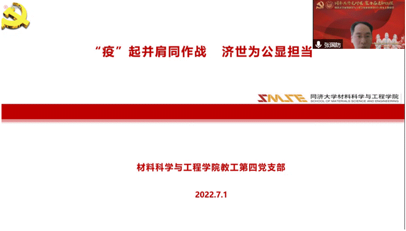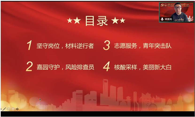 教工第二党支部书记姚雪亮以“嘉园逆行者,抗疫材料人”为题,将学院教师逆行嘉定校区的疫情防控志愿服务故事娓娓道来。校园进入准封闭管理以来,程学院积极投身抗疫一线,领导干部第一时间奔赴到岗,青年志愿突击队第一时间响应志愿集结,秉承全校抗疫一盘棋的理念,成功演绎了“风险排查员”、“宿舍送餐员”、“物资运输员”、“协调引导员”和“核酸采样员”等重要角色,用志愿红筑起防疫的“红色屏障”,在嘉园的各个岗位上积极贡献材料人的力量。