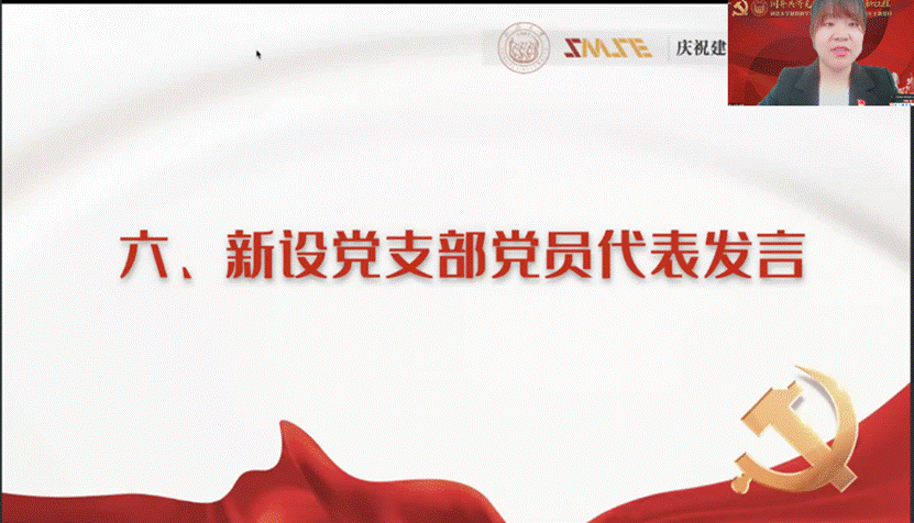 新设党支部党员代表研究生第八党支部赵桐同学发言。作为新设党支部的一员,她谈及,作为一个新生的学生党支部,将对标争先,探索前进,完成上级党组织交代的各项任务和活动,严格推进党支部的标准化规范化建设,力争在学校和学院老师们的指导下,合力把研究生第八党支部打造成一个充满活力的先进党支部。