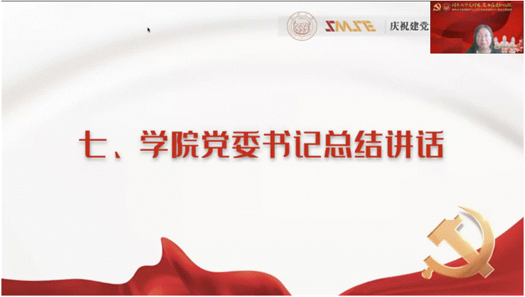 学院党委书记杨晓杰在最后做总结讲话。杨老师高度赞扬了战疫期间,学院师生踊跃投身于疫情防控一线,彰显了同舟共济的同济精神和冲锋在前的时代担当;对于疫情防控期间,坚守岗位、积极配合支持学校学院疫情防控管理工作的师生表示感谢,特别感谢了各方校友在抗疫工作中对母校的支援与帮助,希望全院继续同心协力,共同推进疫情常态化管理下教学科研工作奋起直追,聚力奋进学院高质量发展新征程。她指出:今年是中国共产党成立101周年,希望广大师生赓续伟大建党精神,树立“与祖国同行”的理想信念,胸怀“以科教济世”的家国情怀,争做走在时代前面的奋进者、开拓者、奉献者!