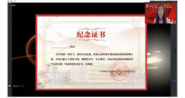一个个战疫故事深入人心,一份份情怀鼓舞大家。在这场刻骨铭心的大上海保卫战中,学院的每一个同志都是一面旗帜,构成了疫情防控的坚强堡垒。为纪念在此次防疫工作中并肩战疫的坚毅岁月,学院党委特邀请校党委学研工部副部长王小莉为所有致力于共同打赢大上海保卫战的志愿者们“云”颁发纪念证书。王小莉副部长指出:“听到了师生的战疫故事,深深感受到了同舟共济、自强不息的同济精神,深受感染,在学校统一领导下,大家并肩作战,汇聚战疫磅礴力量,感谢每一位志愿者为此次疫情防控做出的贡献”。随后,由学生骨干杨思禹同志宣读了包含84位教工与302位学生在内的疫情防控志愿者名单。
