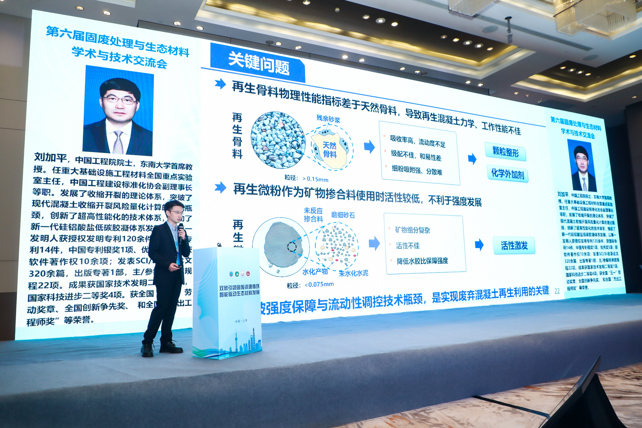 主旨报告环节汇聚了多位国内外著名专家的精彩分享。东南大学刘加平教授作了题为《大宗固体废弃物资源化利用与混凝土可持续方法》的主旨报告。刘教授深入分析了混凝土行业在固废资源化利用中面临的成本高昂、环境污染等突出挑战,提出了技术革新、施工工艺改进和绿色建筑理念推广等多维度解决方案。报告为行业实现绿色转型提供了新思路,有效推动了“双碳”战略的具体实施。