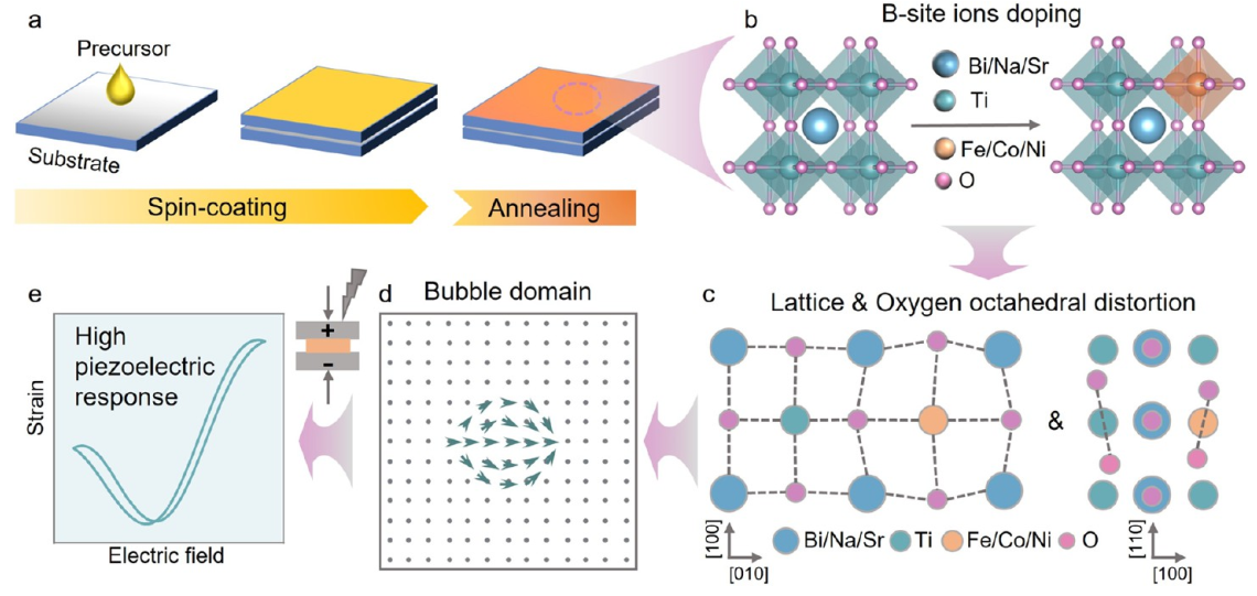 机械能与电能的高效双向转换能力,使压电材料成为下一代智能系统的核心,广泛应用于纳米发电机、医疗微型设备、先进机电传感器等领域,并推动压电光催化染料降解、新型能量采集等创新技术发展。压电效应本质源于材料极化与机械应力的耦合响应,而畴结构(如铁电体中的拓扑畴)正是极化的微观载体。近年来,铁电薄膜中的纳米拓扑畴(如斯格明子(skyrmions)、气泡畴(bubble domains)等)因其独特的物理性质成为研究热点。