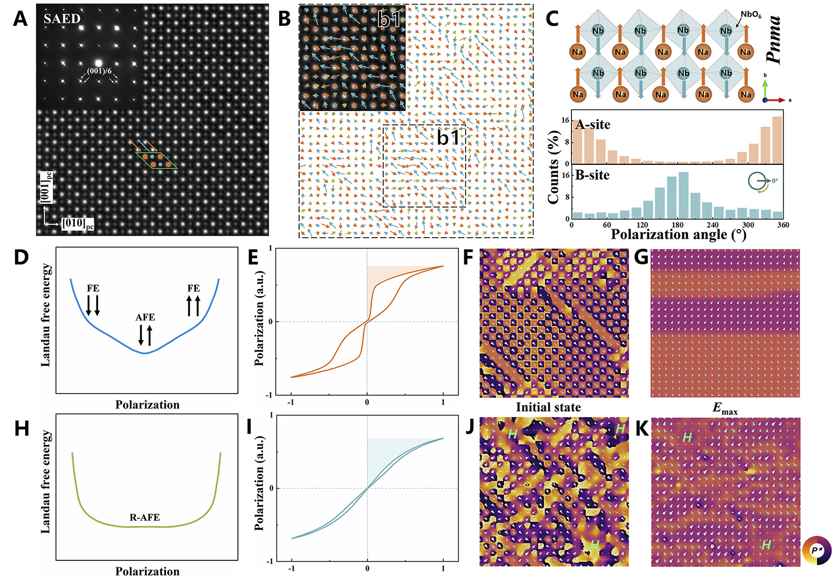 介电陶瓷电容器作为电子设备的核心元件之一,因其超高的功率密度、毫秒级的充放电速度及卓越的可靠性,在消费电子、新能源并网、脉冲功率装备及医疗设备(如除颤器)等领域展现出巨大潜力。然而,传统反铁电陶瓷材料(如锆酸铅,PbZrO3)虽经多年研究,其固有的调制结构(如CM和ICM)仍制约着储能密度与效率的进一步提升,亟需开发新型调控机制。同时,NaNbO3是无铅反铁电材料的重要成员,其弛豫反铁电R相结构显示出独特的储能优势。但是其反铁电相变的大滞后和反平行极化证据的缺乏阻碍了能量存储性能。