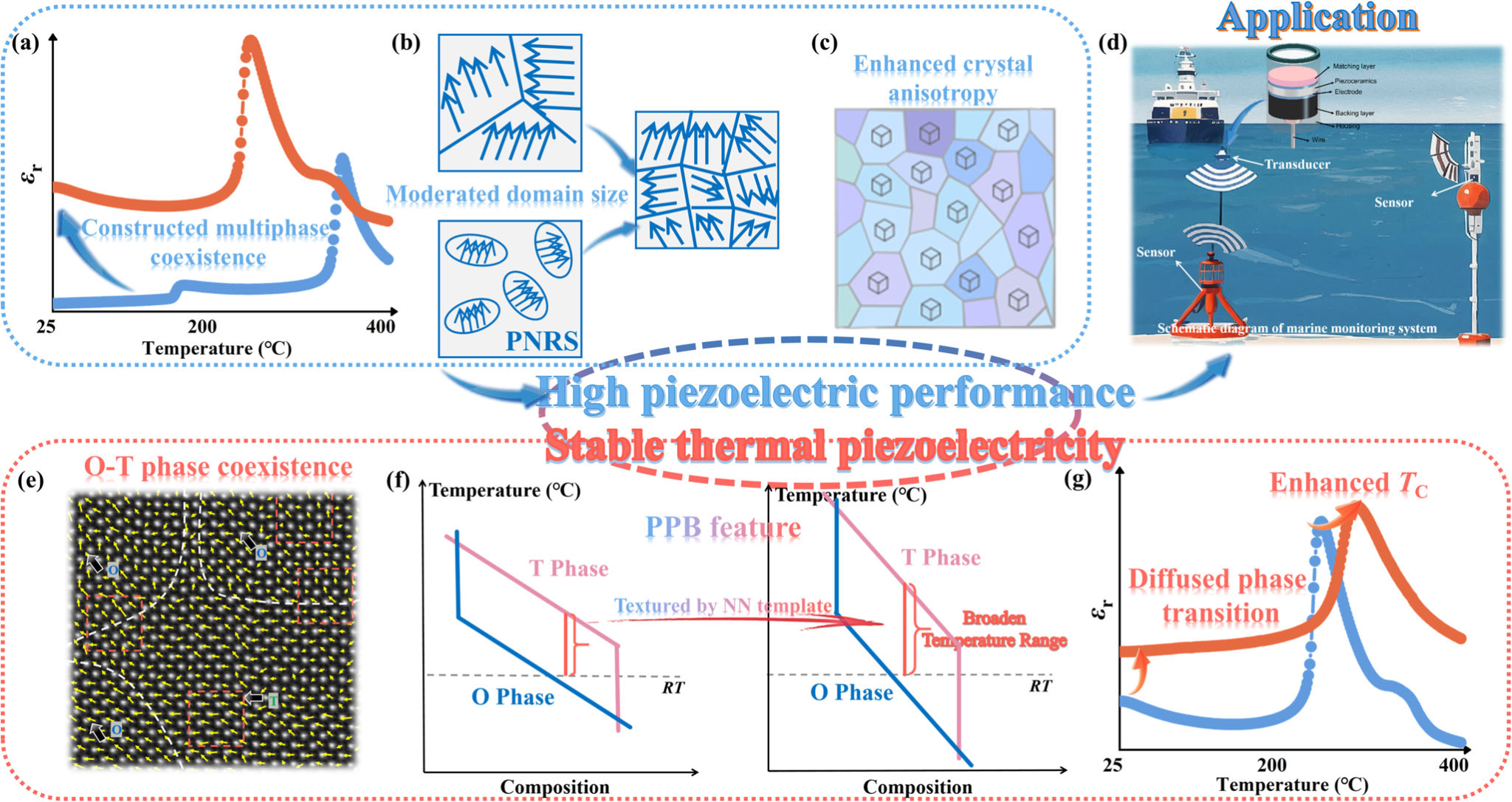 压电材料的畴结构在决定其压电/应变性能方面起着关键作用。气泡畴(BDs)对进一步增强材料的压电/应变性能方面展现出大的希望。但是理解和利用BDs来实现这一目标是一个重大的科学挑战;在无铅压电陶瓷中,铌酸钾钠基((K,Na)NbO3, KNN)压电陶瓷具有较高的压电性能和居里温度等特点,但是温度稳定性与铅基压电陶瓷还相差甚远,限制了其潜在应用;铁酸铋基(BiFeO3, BF)压电陶瓷具有优异高温压电性能,是发展下一代极端环境应用型环保电子器件的关键材料;BiFeO3-BaTiO3(BF-BT)基压电陶瓷有良好的铁电/压电性能和高居里温度展现出解决相关技术难题的潜力,但如何有效协调压电性能与热稳定性之间的矛盾仍是该领域面临的重要科学挑战。