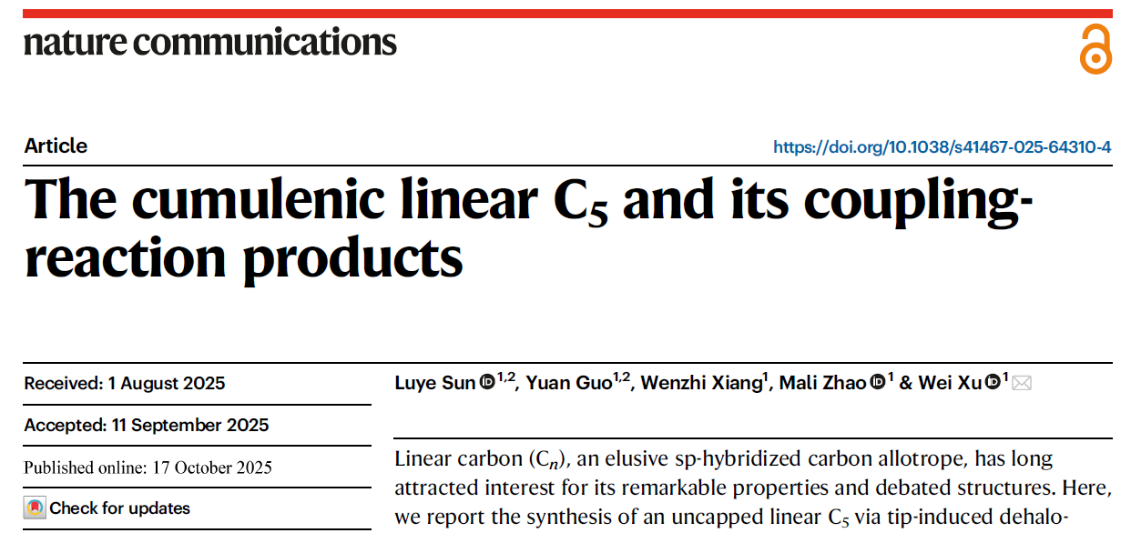 许维教授团队在新型分子碳材料研究领域取得进展。9月26日和10月17日,《自然•通讯》(Nature Communications)先后在线发表了该团队的两篇研究论文,题为“An sp-sp2-hybridized molecular carbon allotrope C16 flake”和“The cumulenic linear C5 and its coupling-reaction products”。研究团队通过原子操纵技术,首次实现了sp-sp2杂化型C16片与系列线型碳的表面精准合成与精确测量。合成的新型分子碳材料作为碳基量子材料,在分子电子器件和磁性信息材料领域具有潜在的应用前景。