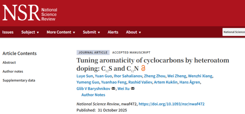 许维教授团队与瑞典林雪平大学、芬兰赫尔辛基大学及瑞典乌普萨拉大学等国际合作团队的最新科研成果“Tuning aromaticity of cyclocarbons by heteroatom doping: C12S and C12N”。该研究利用扫描探针显微技术,成功合成了两种杂原子掺杂的环型碳:C12S(硫掺杂环型碳)和C12N(氮掺杂环型碳),并结合理论计算揭示了它们在芳香性上的根本差异。