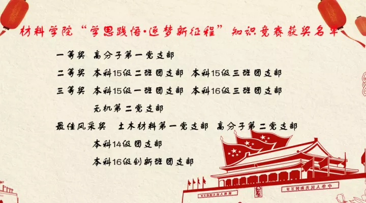 本次知识竞赛由材料学院各学生党支部、团支部和教师党支部参加,每支团队由三位党员或团员组成。整个知识竞赛设置必答题、抢答题和决杀题三种形式,内容主要涵盖党的十九大报告和《中国共产党章程》。比赛结束依据各队得分高低排定名次,设置一等奖1名、二等奖2名、三等奖3名以及最佳风采奖4名。