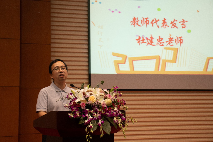 高分子系主任杜建忠老师作为教师代表发言,杜老师以研究生的研究精神为主题。向大家分享了做研究要有四种精神。一是要有提出问题的精神。杜老师用以糖制糖和修复安倍晋三溃疡粘膜为例,讲述了跳跃性思维与机遇的重要性。杜老师认为作为一名研究生应该把不可能解决的问题联系起来,大胆地提出新问题。二是要有解决问题的精神。要敢于迎接挑战,敢于啃硬骨头,敢于亮剑。三是要有团队协作精神。杜老师指出现在的科研工作非团队协作是无法完成的,希望研究生在科研团队中要积极培养良好的沟通能力、协作能力、合作意识、合作精神。四是要有舍得精神。不应该去追求短期的目标和利益,只有淡泊名利才能终成大器。