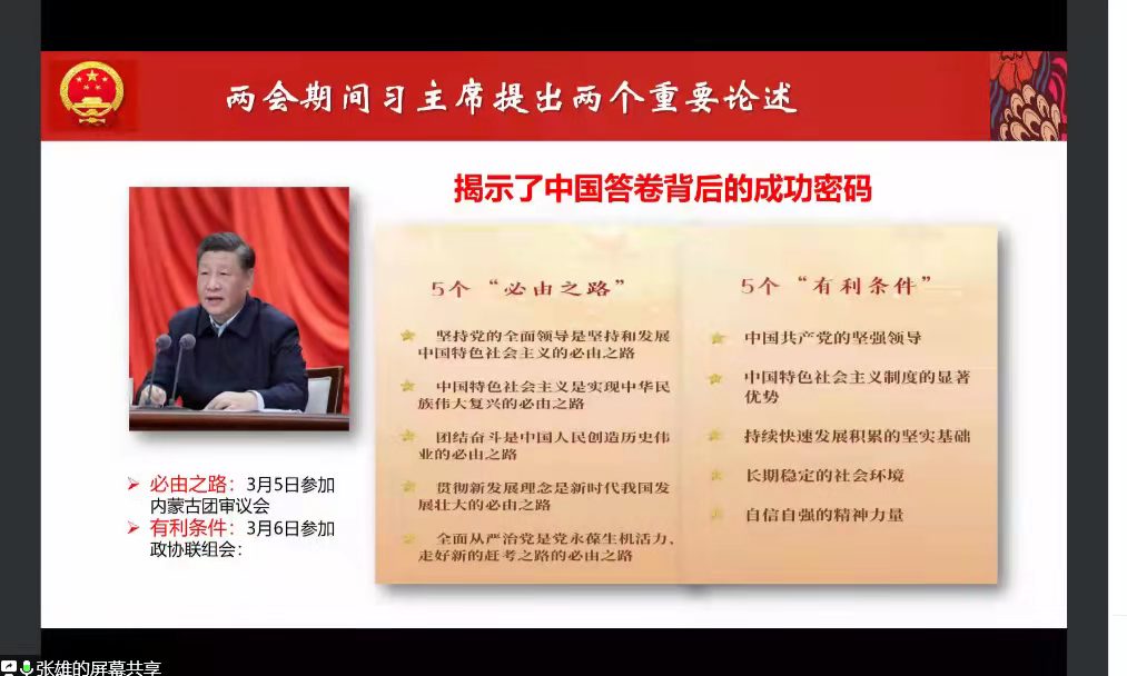 张雄教授对两会精神深入细致的解读与分享,引发了材料学子诸多更为深层的思考,同学们更为真切领悟到两会精神中的一系列关键词,体会到国家层面的点点滴滴与我们的生活是如此息息相关,在云端深学笃行中彰显青年担当,在感知时代脉搏中凝聚奋进力量。