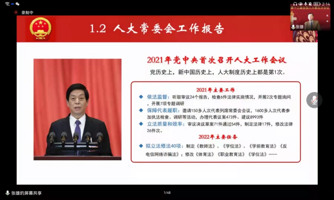 教授、博士生导师、第十一届、第十二届、第十三届全国人大代表、国务院学位委员会评审委员张雄教授,为学院近400位学生党员和入党积极分子在腾讯会议线上平台解读两会精神,领悟时代强音。本次报告会由学院党委副书记王凌凌老师主持。