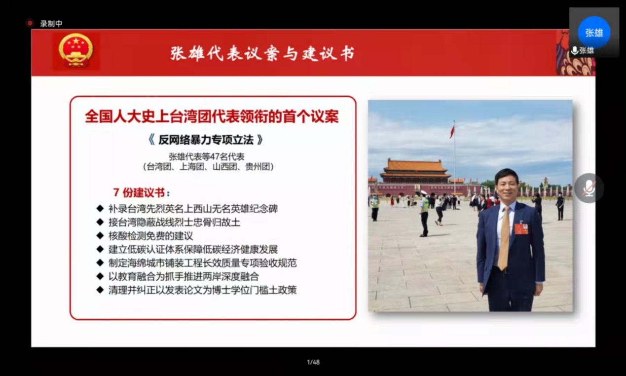 报告会最后,张雄教授抒发了担任台湾团人大代表独特感受,并对15年的人大代表历程加以总结。张老师一直依法为民履职,情系祖国统一。此外,在十三届全国人大五次会议张雄教授与47名代表还向大会提交联名议案,建议为反网络暴力专项立法,成为全国人大史上台湾团代表领衔的首个提案。