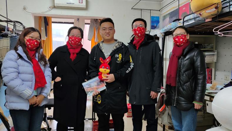 党委书记杨晓杰、院长许维、党委副书记梁春江以及学生工作办公室老师一同走访实验室及学生宿舍,看望并慰问了其他留校学生,通过亲切深入的互动交流,老师们全面了解学生寒假期间留校的原因,询问了近期的学习、生活、科研情况与生活需求,表示学院为留校学子开通科研测试绿色通道。同时叮嘱同学们寒假期间要注意劳逸结合,保重身体,遇到困难及时与学院的老师们联系,学院会尽全力帮助同学们解决。最后学院老师为每位同学送上了丰厚的新春大礼包及俏皮可爱的兔年公仔,与同学们一起用活泼萌趣的兔年窗花装点宿舍,为大家送上了新春祝福,令留校学子感受到“材料大家庭”的温暖。