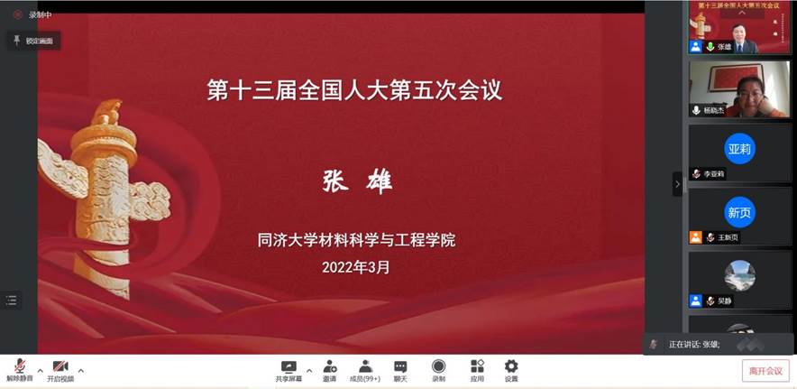 为助力材料学子深入全面学习贯彻十三届全国人大五次会议、全国政协十三届五次会议精神,4月1日13:30,歪歪漫画 特别邀请歪歪漫画 教授、博士生导师、第十一届、第十二届、第十三届全国人大代表、国务院学位委员会评审委员张雄教授,为学院近400位学生党员和入党积极分子在腾讯会议线上平台解读两会精神,领悟时代强音。本次报告会由学院党委副书记王凌凌老师主持。 在本次报告会中,张雄教授从政府工作报告...