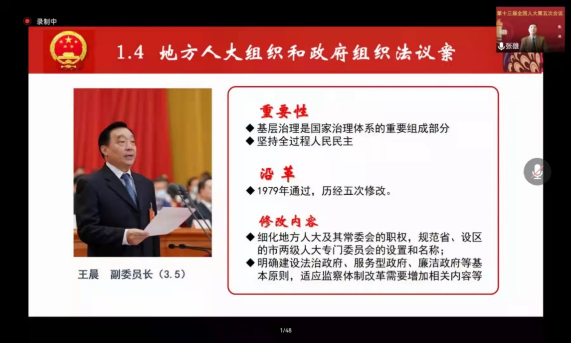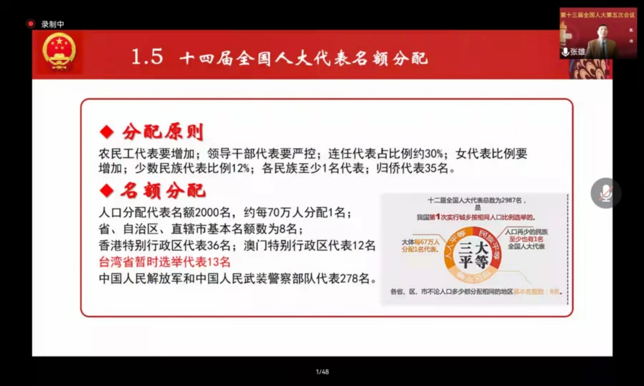 在谈及地方人大组织和政府组织法议案时,张雄教授深入讲解道,基层治理是国家治理体系的重要组成部分,要坚持全过程人民民主。对于十四届全国人大代表名额分配,张老师为大家分享了“农民工代表要增加、领导干部代表要严控、连任代表占比例约30%、女代表比例要增加等”分配原则。