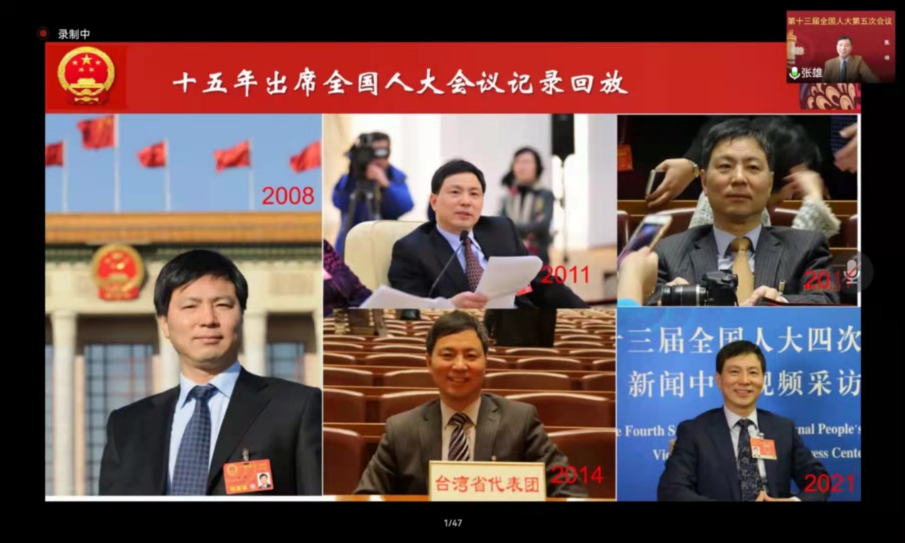 报告会最后,张雄教授抒发了担任台湾团人大代表独特感受,并对15年的人大代表历程加以总结。张老师一直依法为民履职,情系祖国统一。此外,在十三届全国人大五次会议张雄教授与47名代表还向大会提交联名议案,建议为反网络暴力专项立法,成为全国人大史上台湾团代表领衔的首个提案。