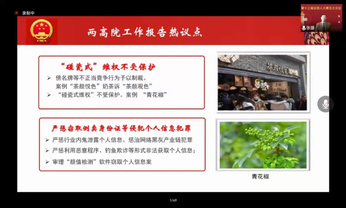 再者,张老师简要概述了人大常委会工作报告里规定2022年的主要任务额,同时以实际案例解读了两高工作报告对于“碰瓷式”维权不受保护、严惩窃取倒卖身份证等侵权个人信息犯罪等热议点。