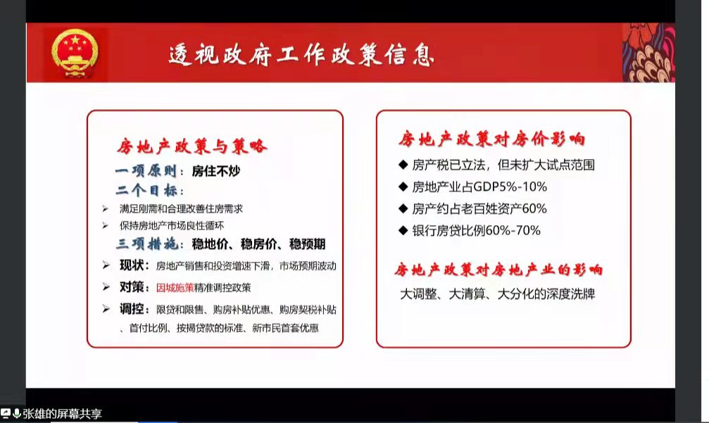 张雄教授首先从两会期间习近平总书记提出的“五个必由之路”和“五个有利条件”两个重要论述引入,特别指出这一系列论述揭示了中国管理答卷背后的成功密码。同时张老师向同学们透视了政府工作报告政策信息以及防疫政策、应对“一老一少”问题等热议点。